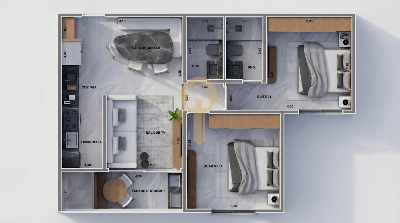 2 Dormitórios, sendo 1 suíte2 Banheiros1 VagaGaragem Coberta1 Copa1 Sala de TV1 Cozinha1 Sala de jantar1 Área de serviço